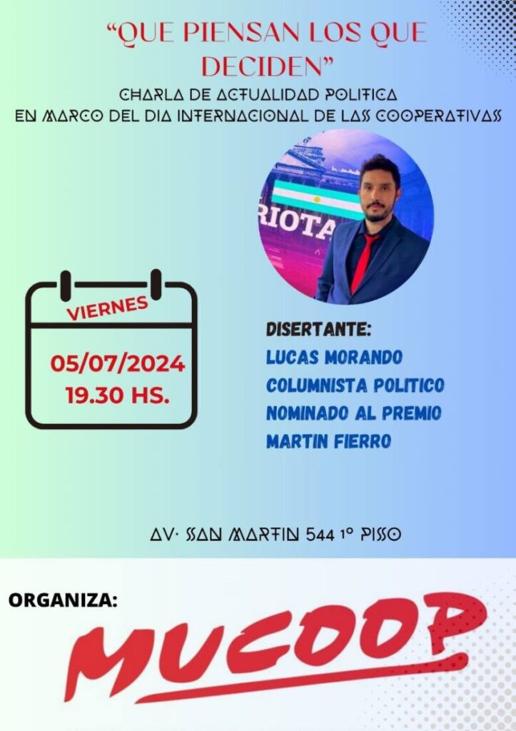 Este viernes a las 19:30hs. en el Salón de Mucoop en Villa Ramallo estará presente el periodista y analista político, Lucas Morando. Brindará una charla bajó la consigna “Qué piensan los que deciden”, una actividad que se da en el marco del Dia Internacional de las Cooperativas.
