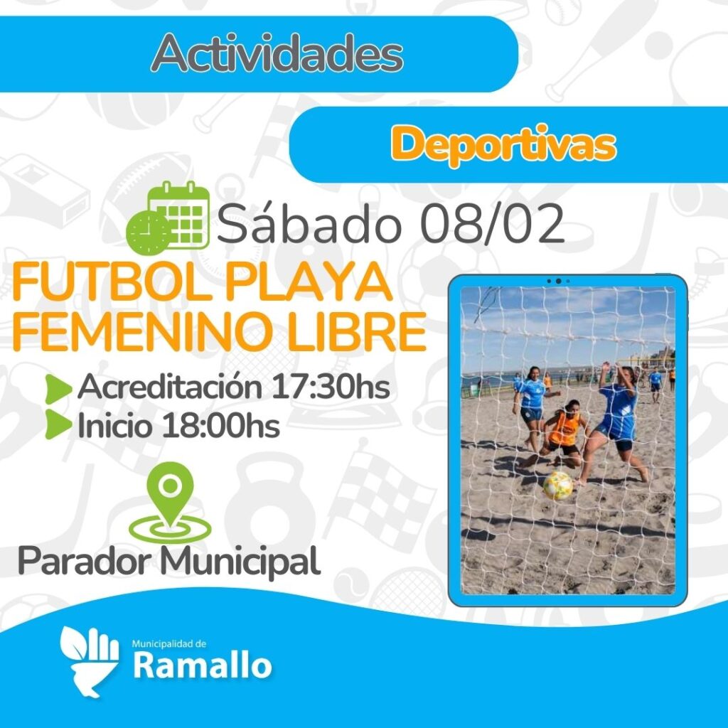 Será este sábado por la tarde en el Complejo de Arena que se encuentra en el Paseo Viva el Río de Ramallo. Se trata de un torneo de fútbol playa femenino libre que se desarrollará durante todo el día. La acreditación comienza a las 17:30hs y a partir de las 18:00hs. se darán los cruces entre los equipos.