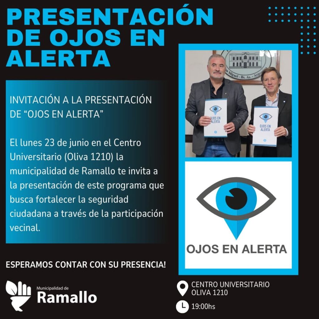 El Municipio de Ramallo invita a la comunidad a la presentación del programa “Ojos en Alerta”, una herramienta digital que conecta a los vecinos con el Centro de Monitoreo Municipal a través de WhatsApp para reportar situaciones de emergencia, delitos o actividades sospechosas. La presentación se realizará este lunes 23 a las 19:00hs en el […]
