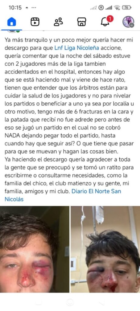 En las últimas horas, el joven hizo un descargo en sus redes sociales donde expresó: “quería hacer mi descargo, para que la Liga Nicoleña accione, quería comentar que la noche del sábado estuve con dos jugadores más de la liga accidentados también en el hospital. Entonces hay algo que se está haciendo mal y viene de hace rato. Tienen que entender que los árbitros están para cuidar la salud de los jugadores y no para nivelar los partidos o para beneficiar a uno ya sea por localía u otro motivo. Tengo más de seis fracturas en la cara y la patada que recibí no fue adrede pero antes de eso se jugó un partido en el cual no se cobró nada dejando pegar todo el partido, hasta cuando hay que seguir así” escribió.