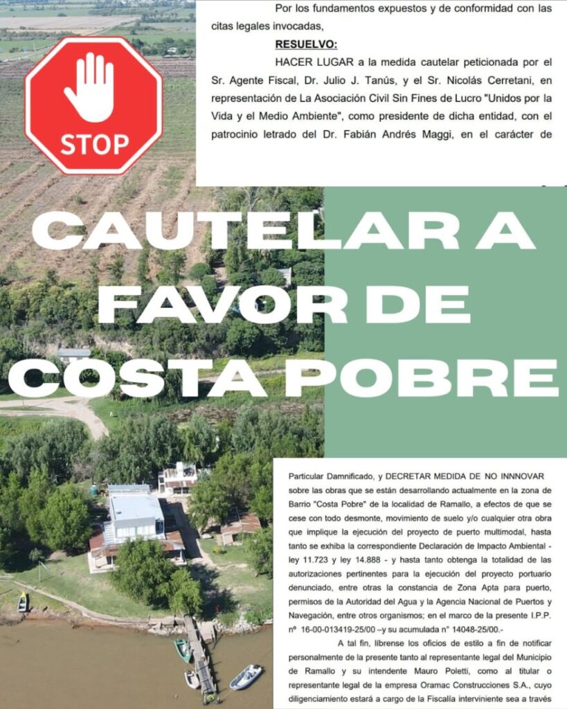 Este viernes la justicia dispuso hacer lugar a una medida cautelar sobre las obras que se están realizando en la zona de Costa Pobre. La medida fue peticionada por el Agente Fiscal Dr. Julio Tanus y Nicolás Cerretani en representación de la Asociación Civil Sin Fines de Lucro “Unidos por la Vida y el Medio […]
