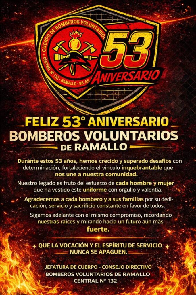 Este 31 de marzo, el cuerpo de Bomberos Voluntarios de Ramallo cumple 53 años de su fundación. Los festejos por el nuevo aniversario incluirán la tradicional cena con los integrantes del cuerpo de bomberos y sus familias; además de un desfile el próximo domingo que recorrerá las calles de Ramallo y Villa Ramallo.